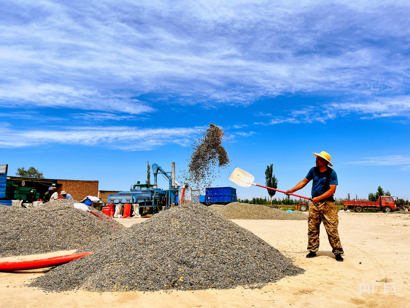 农民在蓝天下奋力铲扬作物,丰收的喜悦在堆场弥漫(央广网发 徐晓瑶 摄)