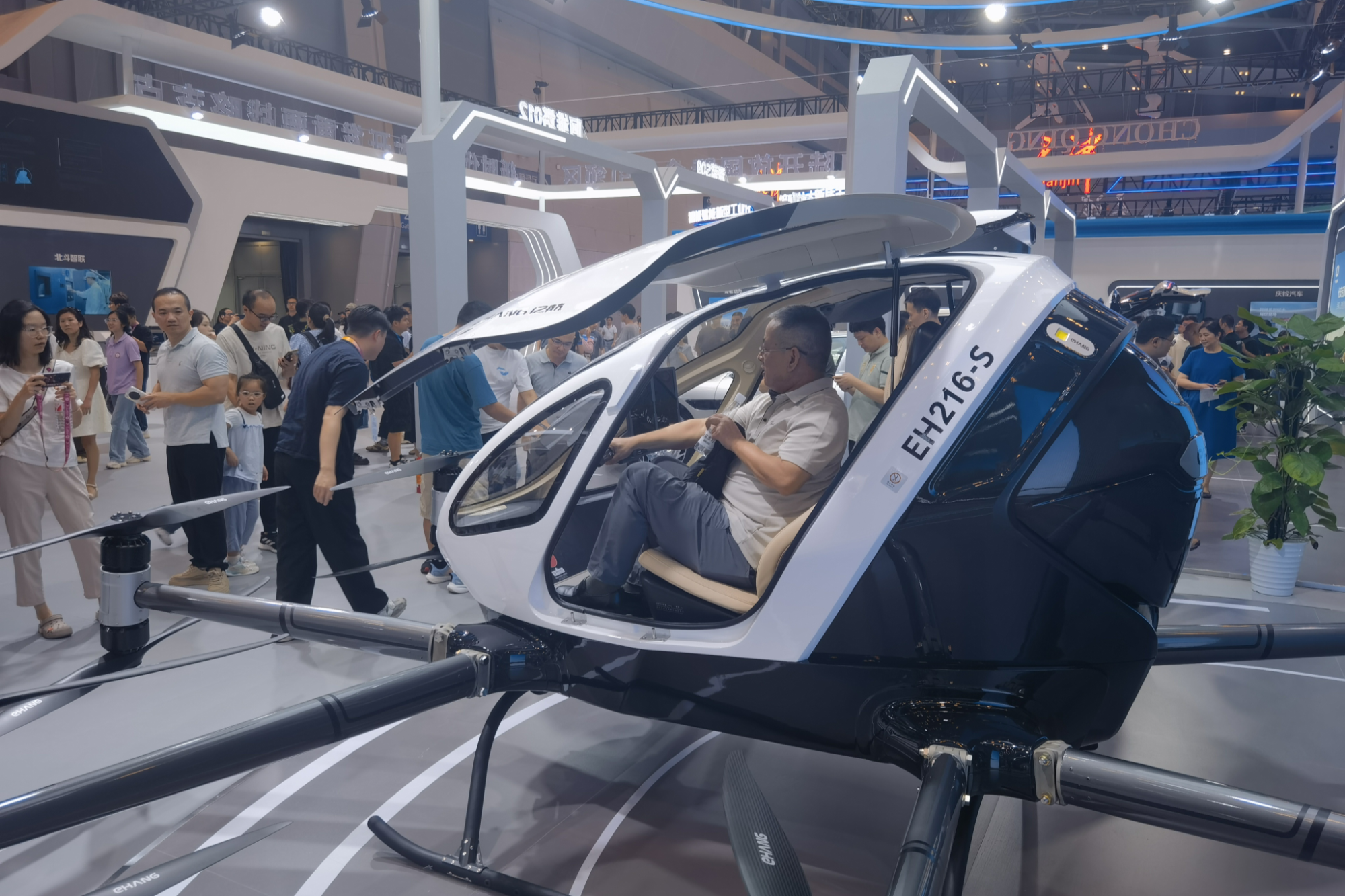 在长安汽车展区,一架载人飞行器前人气满满,吸引了许多观众的眼球,大家排队进入驾驶舱体验。现场工作人员介绍,这款无人驾驶载人航空器,搭载了智能驾驶系统,可以实现无人驾驶,工作人员后台实时监控保证安全,保证乘客空中出行的便捷和安全。从智能汽车到无人驾驶载人航空器,立体交通的未来出行画面呈现在眼前。