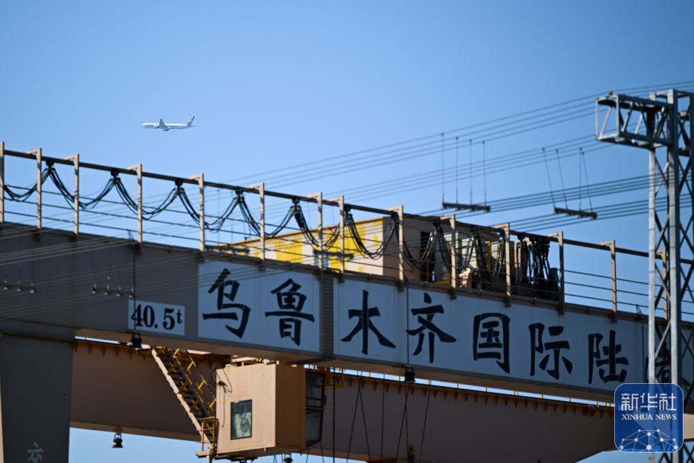 ↑9月15日,一架飞机从乌鲁木齐国际陆港区上空飞过。