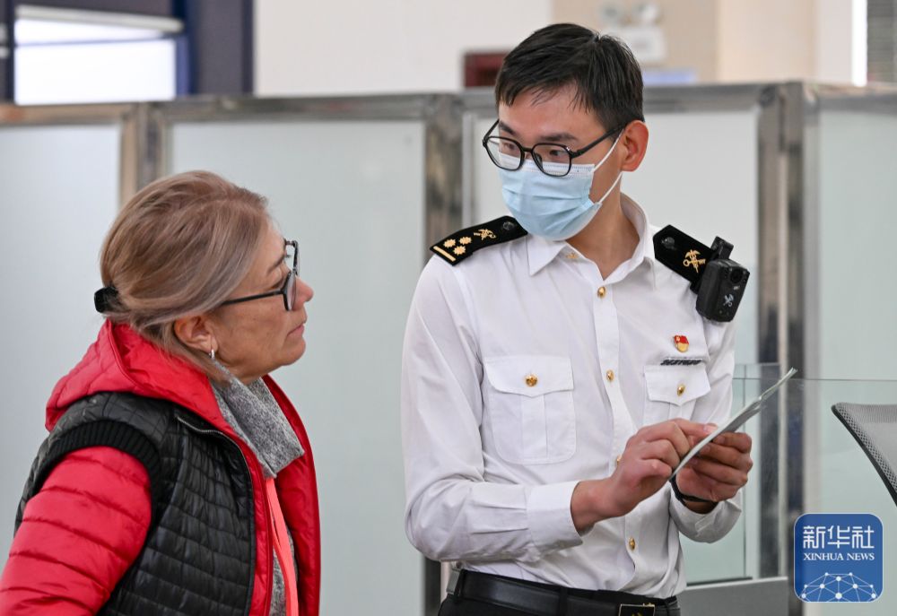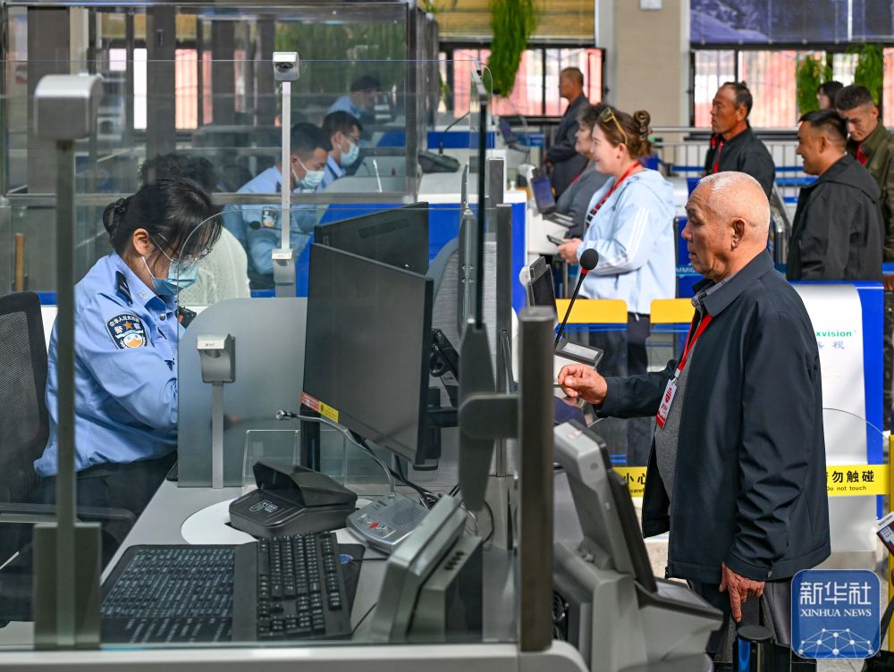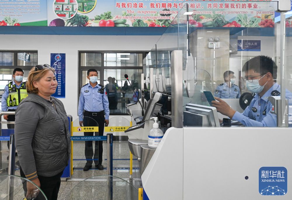 ↑9月17日,巴克图出入境边防检查站的移民管理警察在为来自哈萨克斯坦的旅客办理入境手续。
