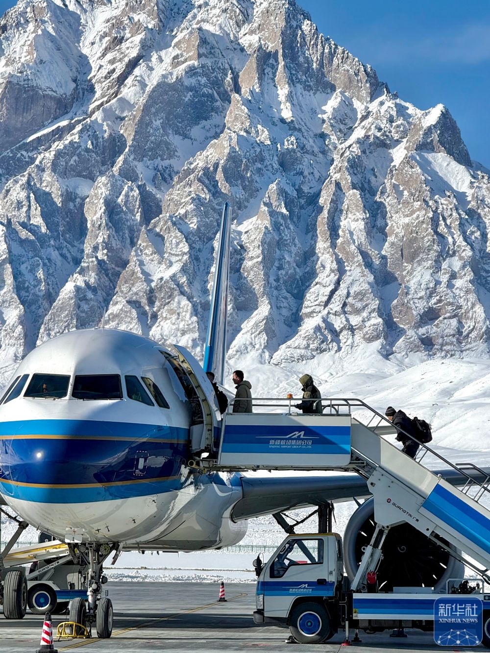 ↑1月13日,旅客在塔什库尔干红其拉甫机场准备登机。