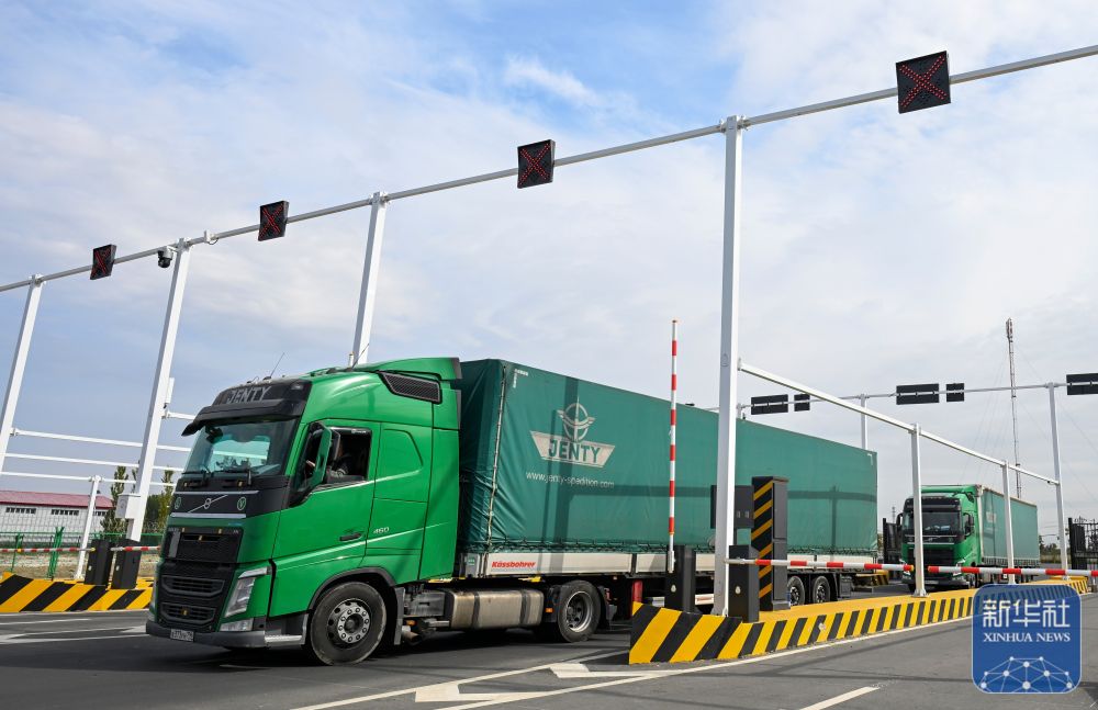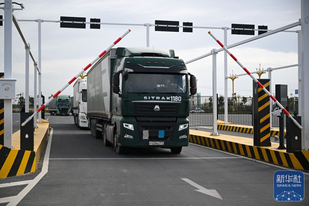 ↑9月17日,来自俄罗斯的货车从位于新疆塔城地区的巴克图口岸海关集中查验场地出关。