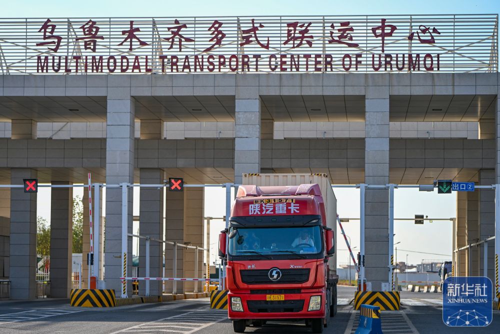 ↑9月15日,一辆货车驶入位于新疆乌鲁木齐国际陆港区的乌鲁木齐多式联运中心。