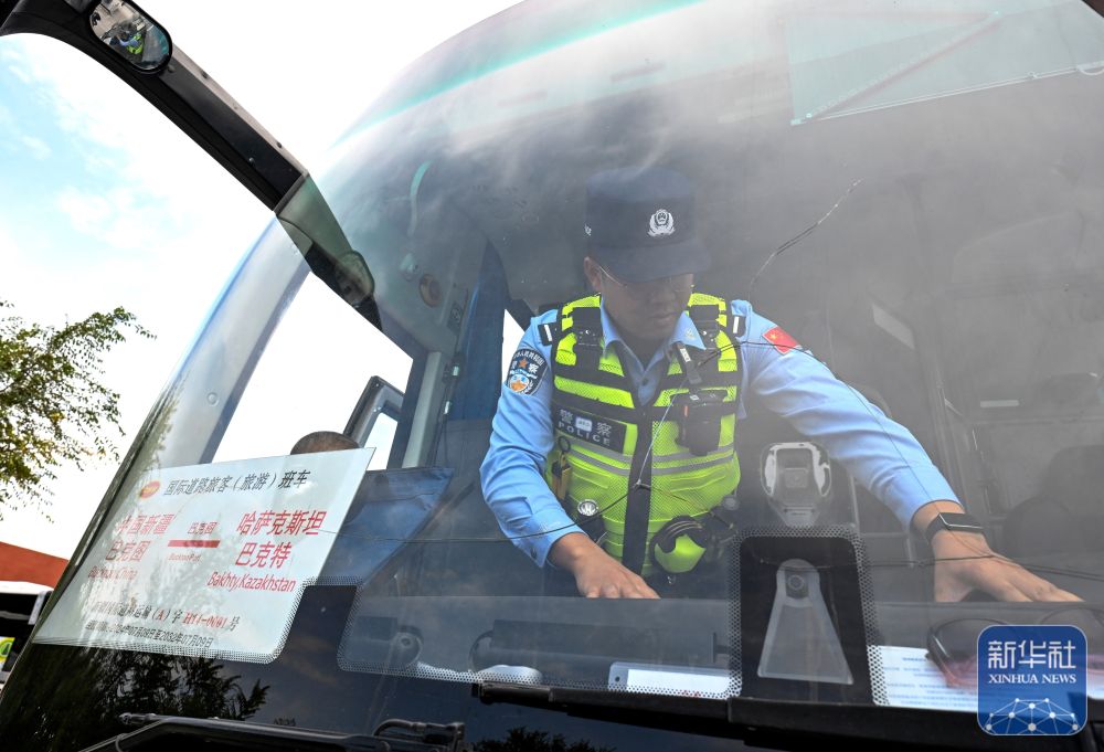 ↑9月17日,巴克图出入境边防检查站的移民管理警察在巴克图口岸查验经由该口岸出境前往哈萨克斯坦的客车。