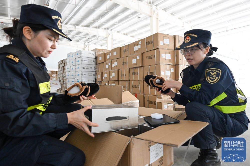 ↑9月17日,新疆塔城海关工作人员在巴克图口岸集中查验区检查一批经由该口岸运往哈萨克斯坦的鞋品。