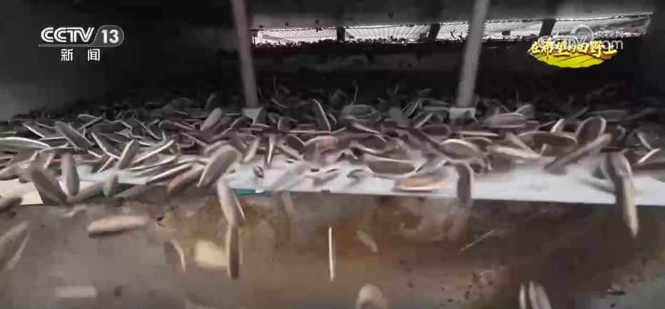 这种节奏感十足的采收方式与向日葵独特的生长方式有关,成熟的向日葵花盘低垂,采收时需要“第一砍”先将花盘砍下,“第二砍”再将株秆砍短,“第三插”把向日葵花盘向上插进株秆。经过几天的充分晾晒后,花盘水分减少,籽粒更加紧实,这时再收进脱粒机完成脱粒作业,经过清选、去杂后发往加工厂。