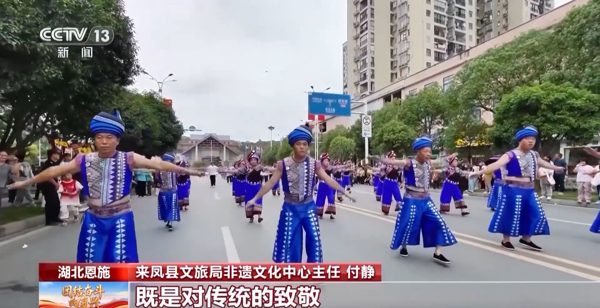 来凤县文旅局非遗文化中心主任 付静:国庆是举国欢庆的日子,用摆手舞巡游的形式庆祝,既是对传统的致敬,也是对新时代的礼赞。