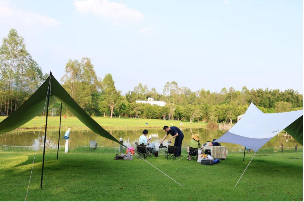 国庆中秋假期,广州的游客在天幕旁享受露营时光。新华社记者钟焯 摄