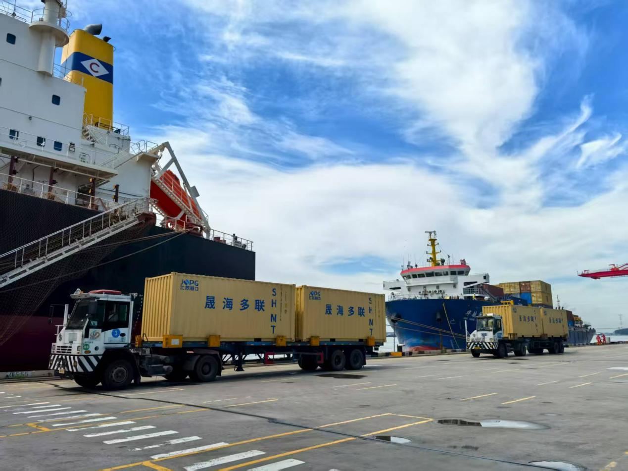 “传统车皮运输需多次倒装,损耗率高、成本大。我们创新采用35吨敞顶箱替代车皮,铁路直发龙潭港后通过专用吊具直接拆箱装船,全程货物不落地、零损耗,每年节省物流成本近2000万元。”晟海公司总经理管俊俊向记者介绍。