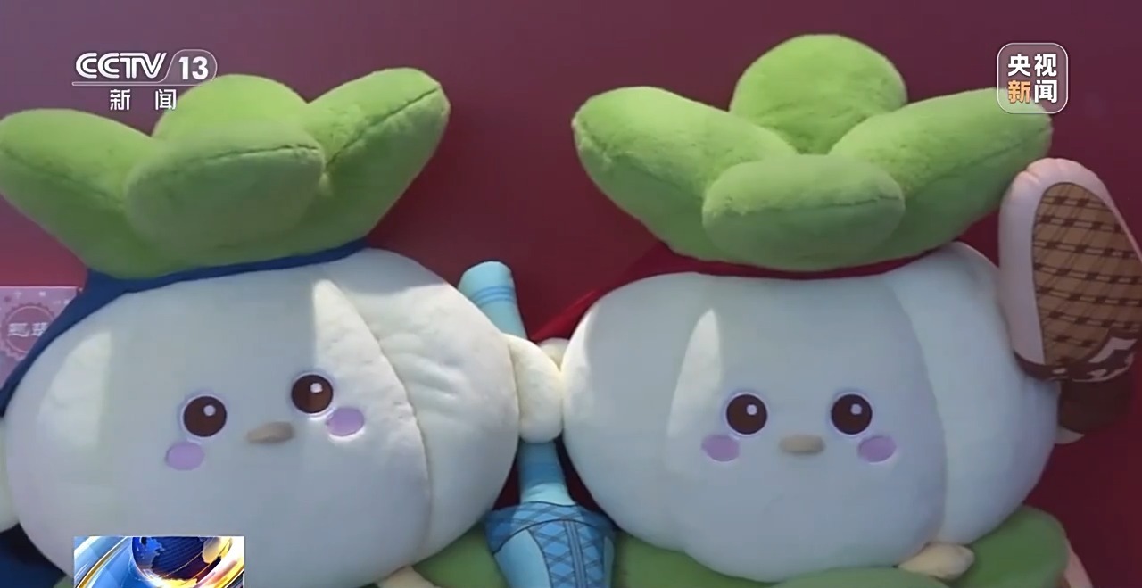 在众多文创新品中,最受欢迎的当数这款“吴越争霸”蒜鸟毛绒包挂。两只“蒜鸟”分别手持越王勾践剑和吴王夫差矛,头戴红蓝飘带,身披披风,造型既威武又可爱,吸引众多游客争相购买。