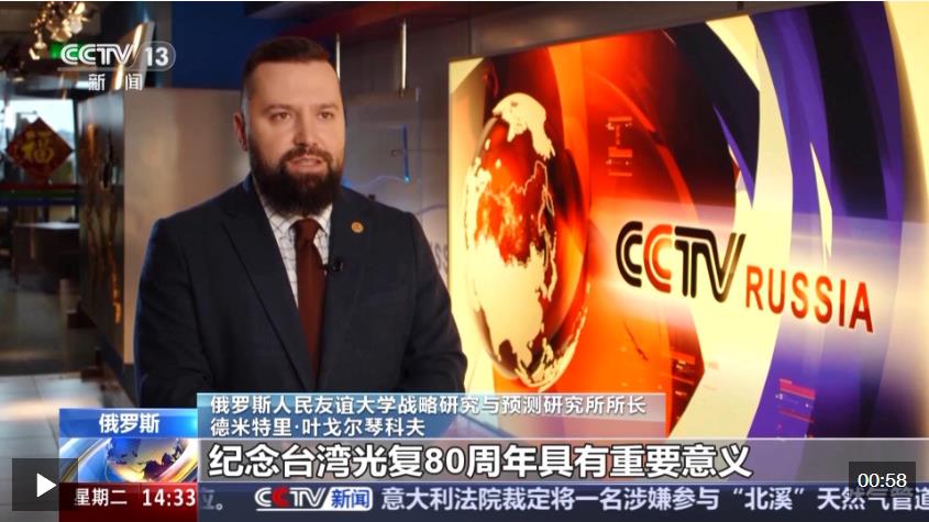 俄罗斯人民友谊大学战略研究与预测研究所所长 德米特里·叶戈尔琴科夫:纪念台湾光复80周年具有重要意义,象征着中国人民心向统一。战胜日本军国主义是世界反法西斯战争的重要组成部分,这一历史应该被铭记。