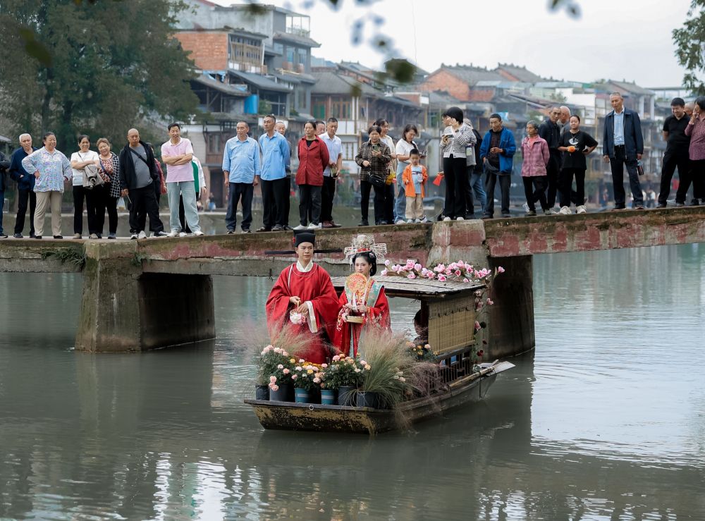 国庆节期间,成都邛崃市夹关古镇举行的水上婚礼仪式。(受访单位供图)