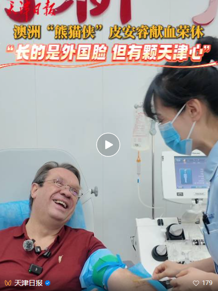 今年已满60周岁的老皮是澳大利亚人,中文名叫皮安睿。从2008年起,连续17年,累计捐献机采血小板 333次、653个治疗单位,捐献全血5次、2000毫升,曾获全国无偿献血奉献奖终身荣誉奖。