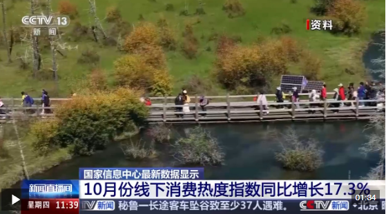 国家信息中心最新数据显示,十月份,线下消费增势良好,尤其是三线及以下城市增速明显。线下消费热度指数同比增长17.3%,其中,一线城市、二线城市同比分别增长18.9%、14.5%,三线及以下城市同比增长31.2%。