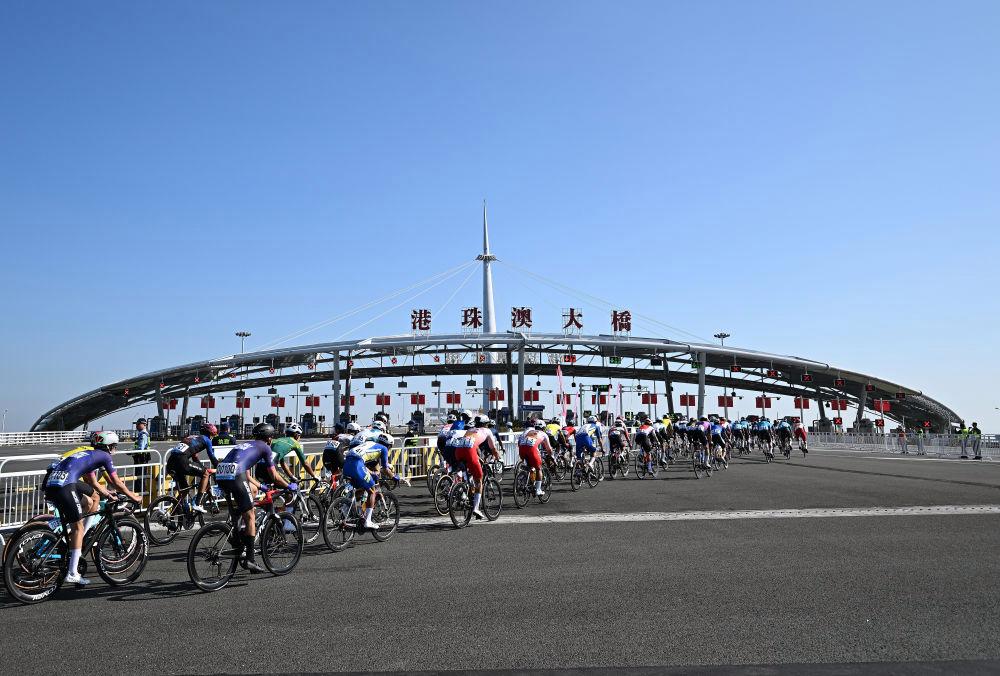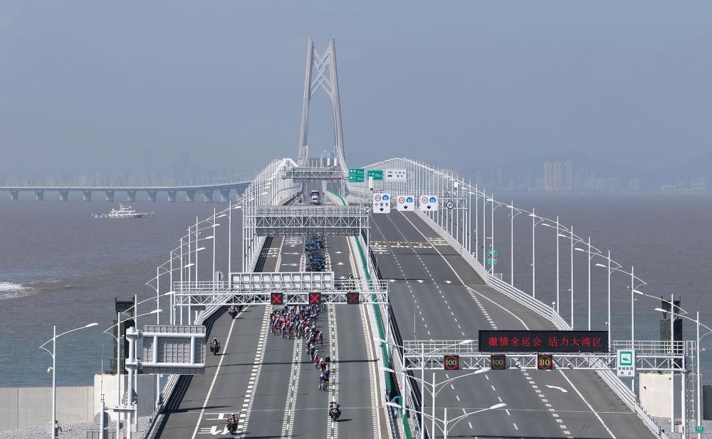 11月8日,在第十五届全国运动会公路自行车男子个人赛决赛中,参赛选手在港珠澳大桥骑行。新华社记者梁旭 摄