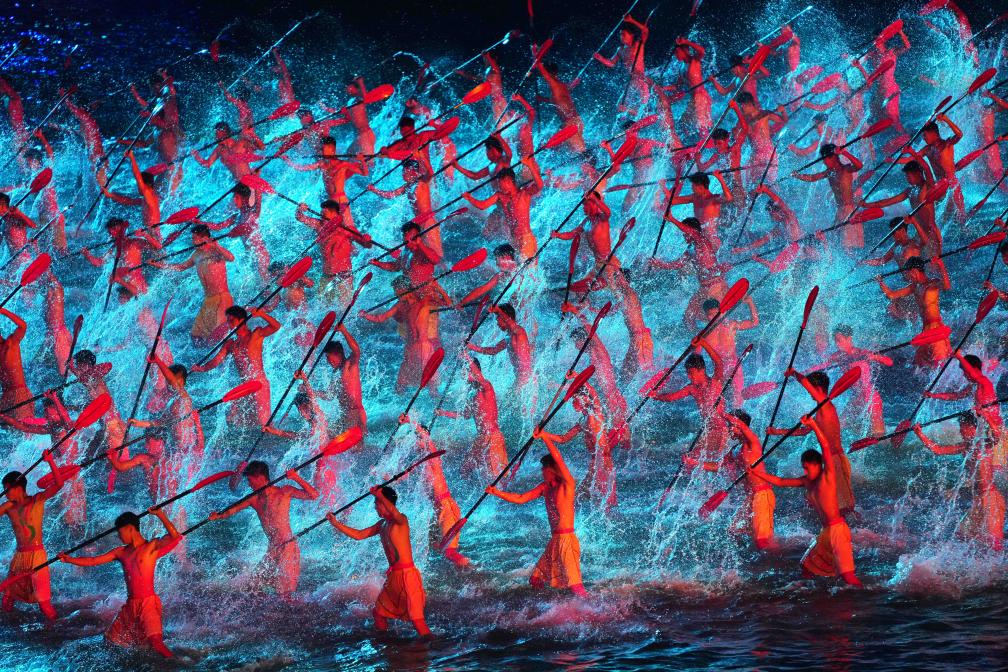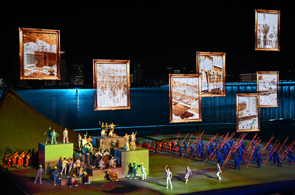 ↑11月9日,在第十五届全国运动会开幕式上,巨型鳌鱼“游入”体育场上空。新华社记者 卢汉欣 摄