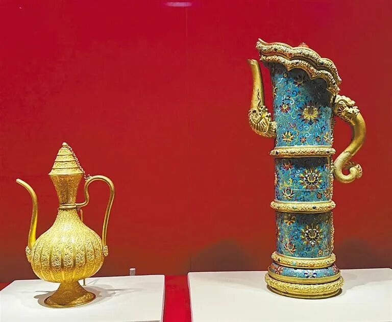 展品金錾云龙纹执壶与掐丝珐琅嵌宝石缠枝莲纹多穆壶的并置,则构成一场意味深长的文化对话。金錾云龙纹执壶是中原传统酒器的代表,通体錾刻云龙纹样,彰显着皇权的至高无上;而多穆壶原是蒙古、藏等民族聚居地区盛水或酥油茶的日用器皿,以其特有的僧帽口、龙柄及缠枝莲纹,展现出西北草原地区的器型特色。当这件多穆壶与金执壶一同陈列于宫廷盛宴时,它们共同陈述着一个事实:清代宫廷文化是一个由多民族文化符号共同构建的体系。