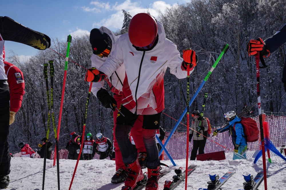 2024年1月24日,教练艾利夫(左)与中国选手王帅(右)在江源道冬青奥会高山滑雪比赛前。新华社记者 张笑宇 摄