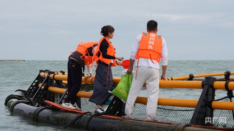 记者(中)在海洋牧场体验饲料投喂(央广网记者 张顺鹏 摄)