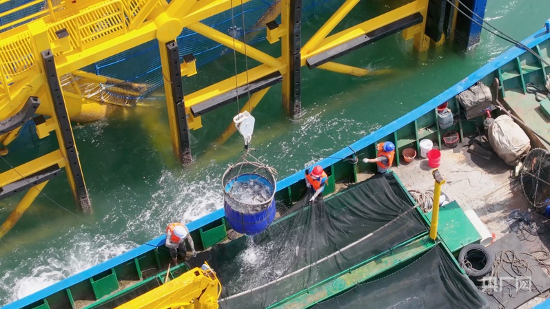 “龙宫号”工作人员将鱼打捞上船(央广网记者 徐钡儿 摄)