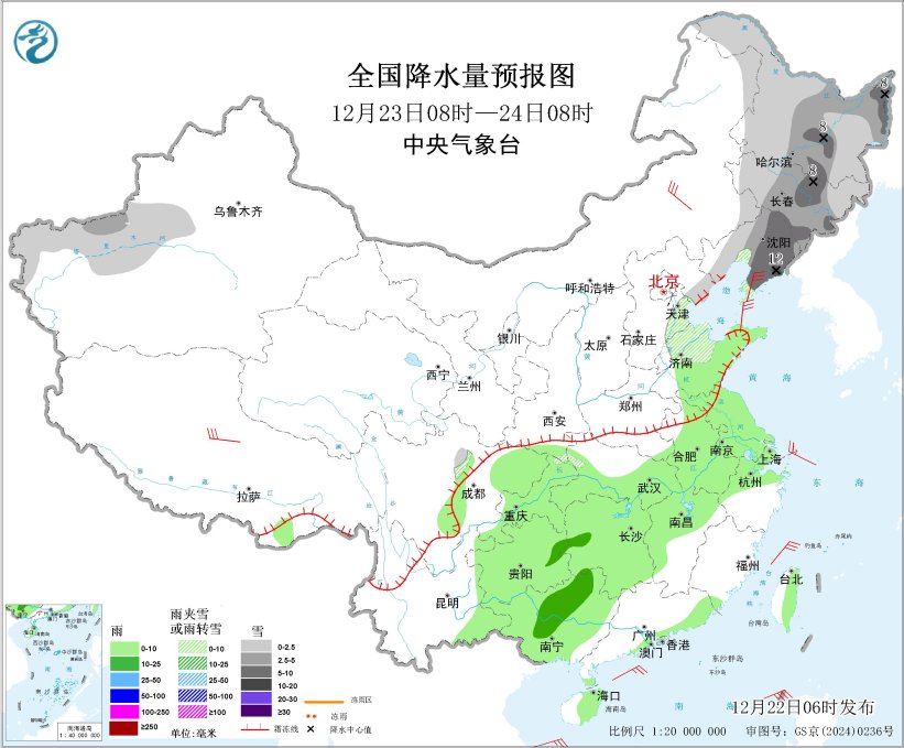 12月23日08时至24日08时,东北地区、新疆南疆西部山区、华北东部、山东北部等地部分地区有小到中雪或雨夹雪,其中,黑龙江中东部、吉林中部、辽宁东部局地大到暴雪(10~12毫米)。黄淮东部、江淮、江汉大部、江南北部和西部、西南地区东部、广西、广东东南部沿海、海南岛东部、台湾岛东部等地部分地区有小雨,其中,湖南西部、贵州东北部、广西中部等地部分地区有中雨。内蒙古中东部、辽东半岛、西藏中北部等地部分地区有4~6级风;渤海、渤海海峡、黄海大部海域、东海西部海域、台湾海峡、巴士海峡、南海北部海域将有6~7级大风、阵风8~9级。
