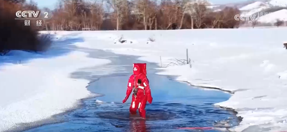 在内蒙古还有一项独特的极寒体验——“躺冰”。零下40摄氏度的极寒环境中,吉尔布干河因地热形成了独特的不冻河景观。依托这一独特景观,当地推出了“躺冰”体验,在安全员与救生员的全程保障下,游客身着专业抗寒服漂浮于冰河之中,在雪山与雾凇环绕间感受极寒中的美景。