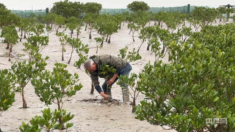 吴昌根轻轻地将滩涂上倒伏的红树幼苗扶正(央广网记者 李晓晓 摄)