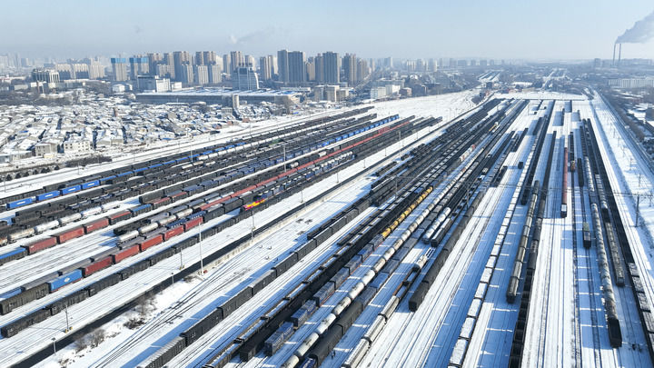 装满物资的货运列车在黑龙江省哈尔滨南站编组站场整装待发。“三九”天以来,针对北方降温降雪天气,中国铁路哈尔滨局集团有限公司哈尔滨南站积极开展电煤、生产物资保供专项行动,全力保障民生物资运输需求(2026年1月15日摄,无人机照片)。新华社发(原勇 摄)