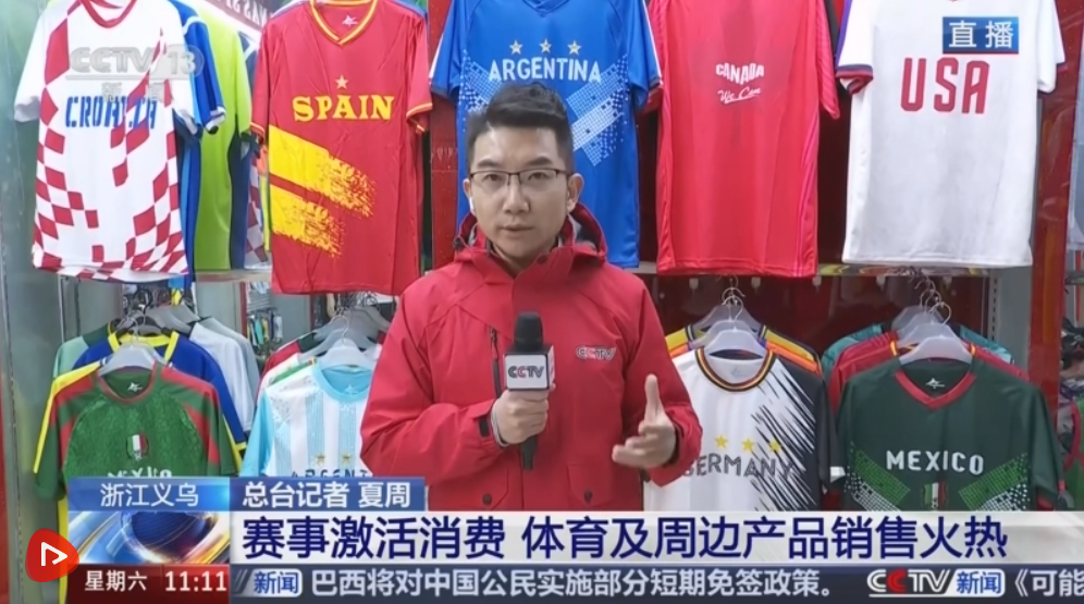 记者现在在义乌国际商贸城三区的体育用品专区,这家商户主营的是足球球迷服,大家还记得四年前的卡塔尔世界杯吗?当时这家店的老板通过观察各个参赛队球迷服的订单走势,特别是赛前那一波波的追单情况,成功预测了阿根廷队会夺冠!您看,体育经济和义乌市场之间就这样有了一次特别巧妙的联动。