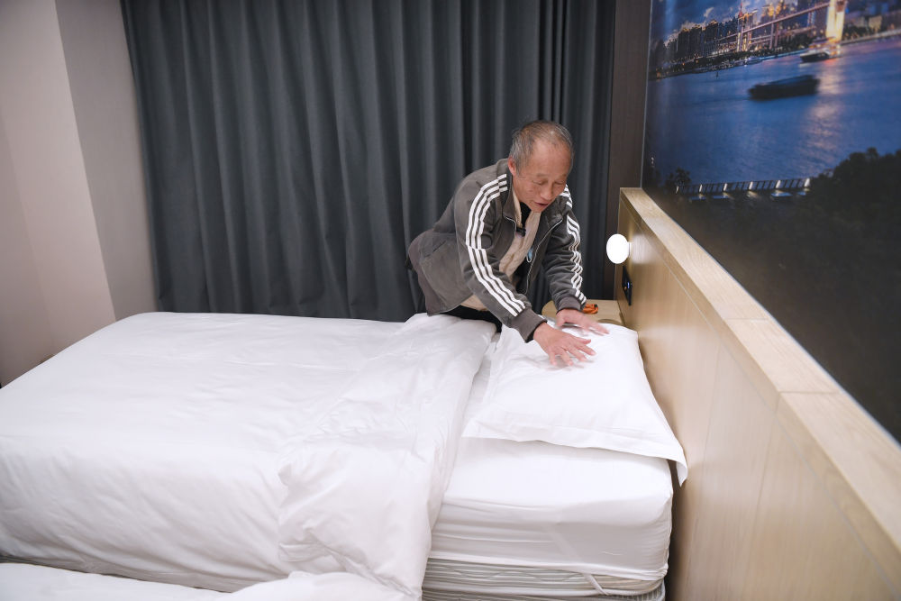 2025年11月28日,宏福苑居民邝佩麟在粤海酒店“爱心客房”里整理床铺。新华社记者 陈铎 摄