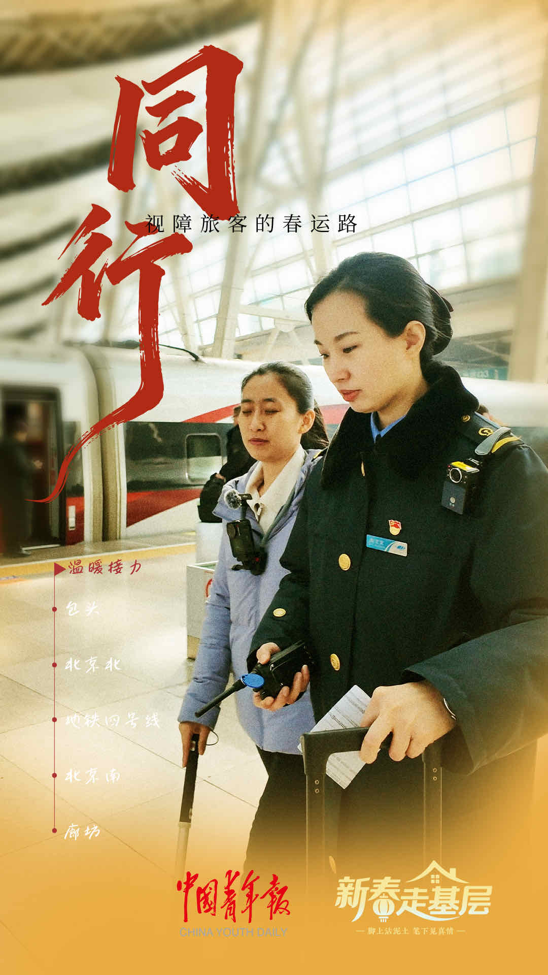 这一路,全程参与接力的铁路、地铁工作人员,有十余人。北京北站的工作人员说,春运期间,日均服务重点旅客50至100人。
