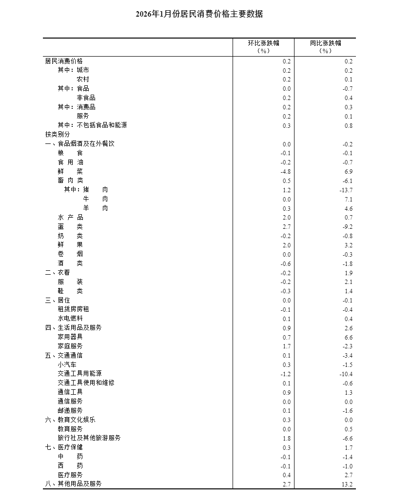 2026年1月份,全国居民消费价格同比上涨0.2%。其中,城市上涨0.2%,农村上涨0.1%;食品价格下降0.7%,非食品价格上涨0.4%;消费品价格上涨0.3%,服务价格上涨0.1%。