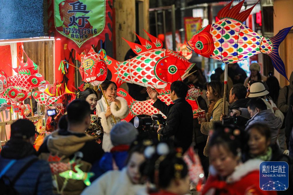2月7日,游客在瞻淇村和鱼灯合影。