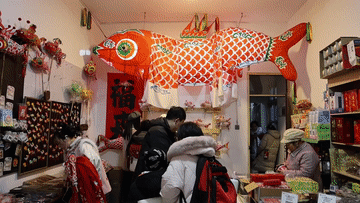 1月29日,在瞻淇村一处店铺内,工作人员展示售卖的鱼灯冰箱贴。