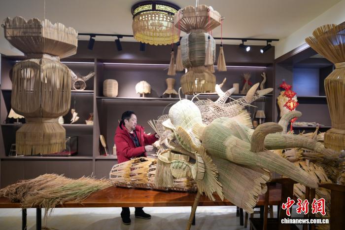 2026年春节假期期间,陈焕彬在工作室内检查草龙龙头。 中新社记者 刘忠俊 摄