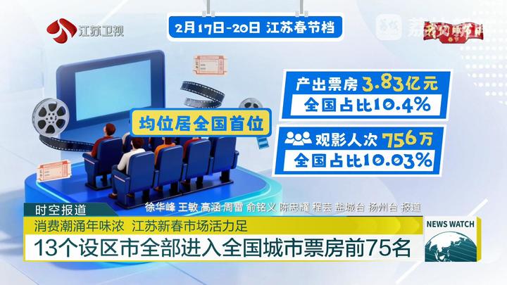 电影票房是文化消费活力的风向标。截至目前,全国春节档电影总票房已突破40亿元。作为全国票仓,江苏电影市场持续领跑全国:2月17日至20日,江苏产出票房超3.83亿元,全国占比10.4%;观影人次超756万,全国占比10.03%,票房和人次均位居全国首位。放眼全国,江苏展现出“万马奔腾”的票房趋势,13个设区市全部进入全国城市票房前75名,苏州、南京、南通、无锡、盐城五市进入全国前20名。