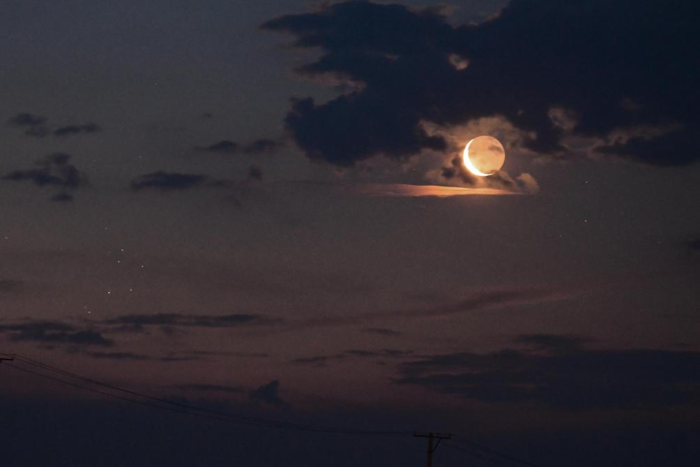 “新月抱旧月”是一种由地球反射太阳光至月球暗面形成的天文现象,表现为明亮月牙与暗淡月面同时可见,这种有趣的天文现象也被称为地照。