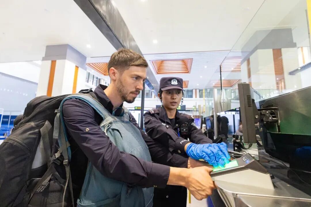 磨憨铁路口岸的工作人员帮助外国旅客使用现代化设备办理通关手续。