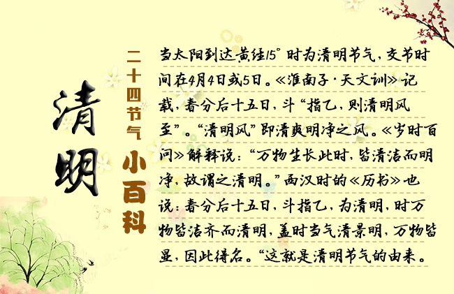 节选自《二十四节气志》/宋英杰 4月5日前后为清明节气,气清景明之意,正是鸟语花香的盛春时节。“言万物去故而从新,莫不鲜明之谓也。”“万物生长此时,皆清净明洁,故谓之清明。”清明之名,便表征了这一时节的天气是清新、明媚、和暖的。