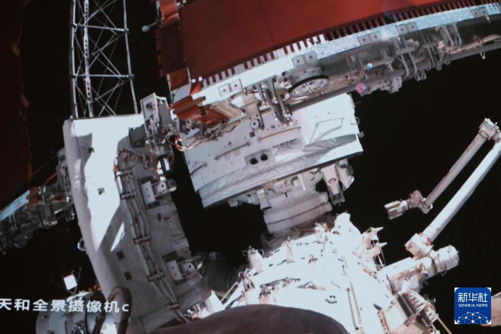 2024年5月28日在北京航天飞行控制中心拍摄的神舟十八号航天员叶光富在空间站组合体舱外作业的画面。新华社记者 李杰 摄