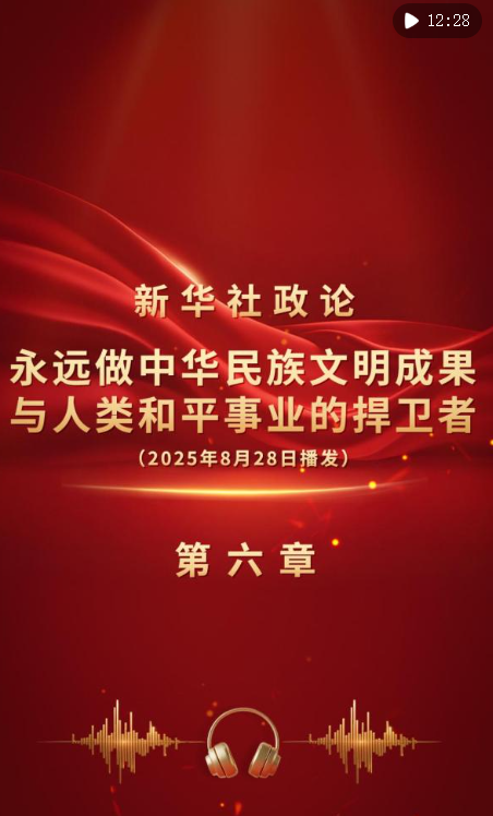 新华社8月28日播发《新华社政论|永远做中华民族文明成果与人类和平事业的捍卫者——写在中国人民抗日战争暨世界反法西斯战争胜利80周年之际》。我们邀请诵读嘉宾刘劲演播“第六章”。