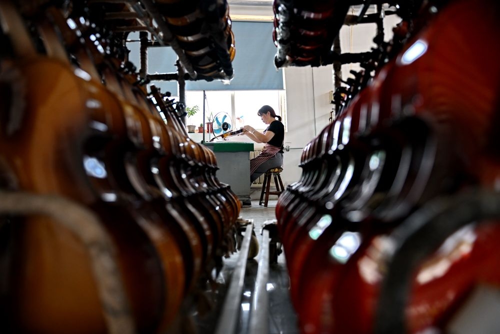 2025年5月28日,河北省武强县一家乐器生产企业的工人在制作尤克里里。武强县乐器产业历经30余年的发展,形成拥有超过150家企业、从业人员万余人的产业集群,产品覆盖100多个品种、400多种规格。近年来,武强县依托乐器文化产业资源,打造集乐器加工、乐器体验、音乐展演和休闲度假等业态为一体的周窝音乐小镇,同时创新“乐器+”乡村振兴模式,持续增强乐器产业的富民强县作用。2024年武强县乐器产业实现营收23.8亿元,旅游收入超10亿元。