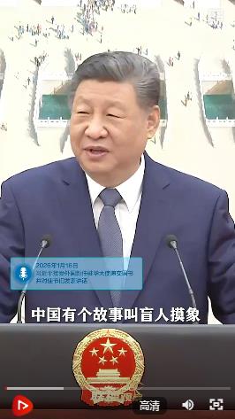 仪式结束后,习主席在对使节们发表讲话时,讲到一则“盲人摸象”的寓言故事。习主席说:“象很大,如果是一个盲人,他摸到一条腿,就说象是一个柱子,摸到肚子,就说象是一堵墙,但实际上不是完整的象。”
