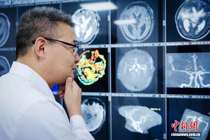 论文共同通讯作者何江弘主任医师在查看影像(图片来源:天坛医院)。中国科学院自动化所 供图