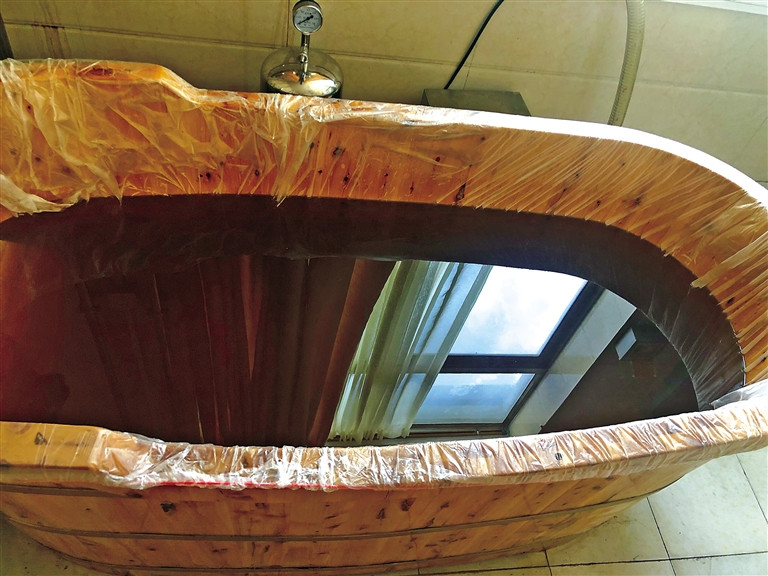 西藏自治区藏医院藏医药浴中心工作人员正在更换一次性木桶套。