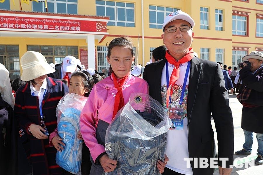 7月11日,王现海与随行团队专家到玛曲县第一小学参加学生们的毕业典礼,并向学生代表送上学习用品。