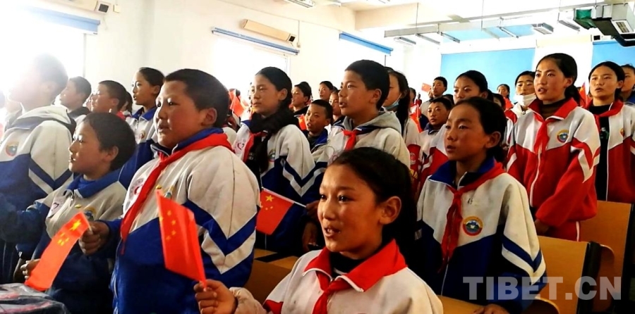 图为四川省甘孜州石渠县第二完全小学学生代表与医疗专家们一起高唱国歌 摄影:刘莉
