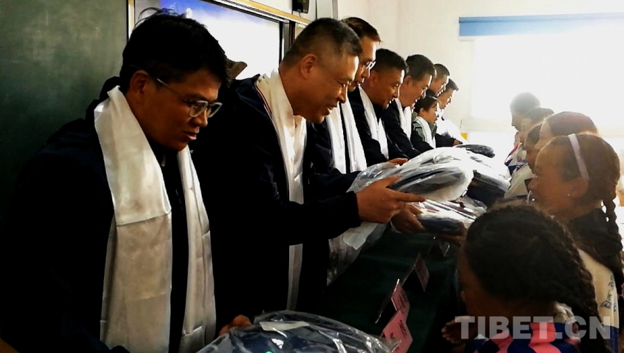 图为医疗专家们向四川省甘孜州石渠县第二完全小学学生赠送学习用品 摄影:刘莉