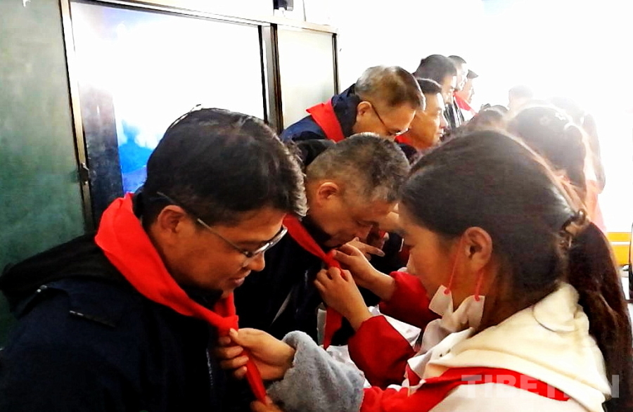 图为四川省甘孜州石渠县第二完全小学学生为医疗专家们献上鲜艳的红领巾 摄影:刘莉