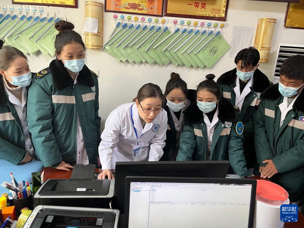 2023年4月30日,浙江医疗援藏专家徐春芳(左三)在西藏那曲市班戈县人民医院为外科护士讲解信息系统使用技能。新华社发